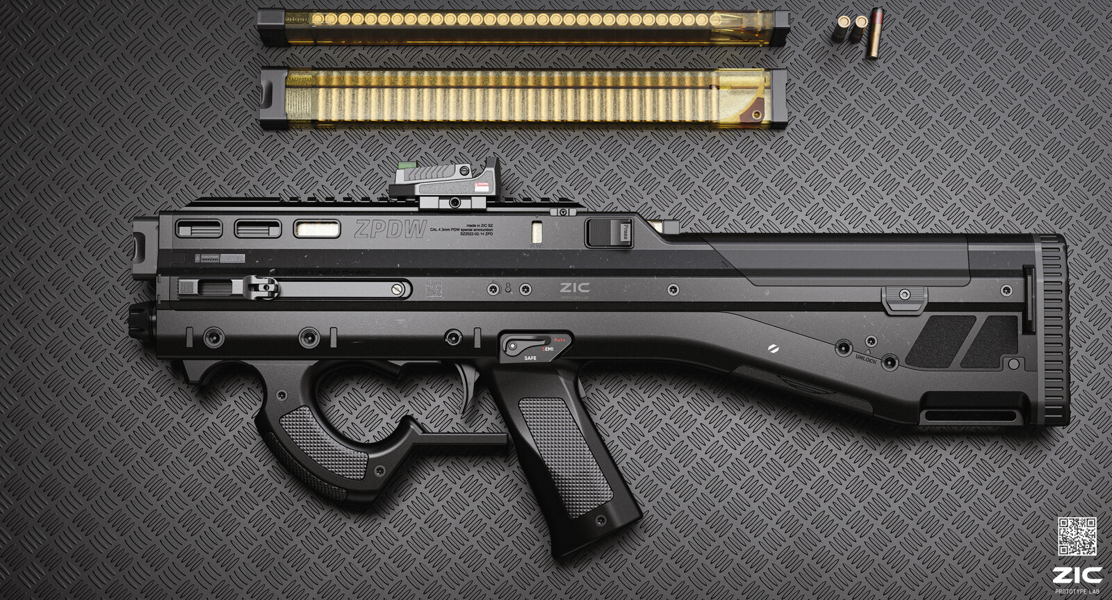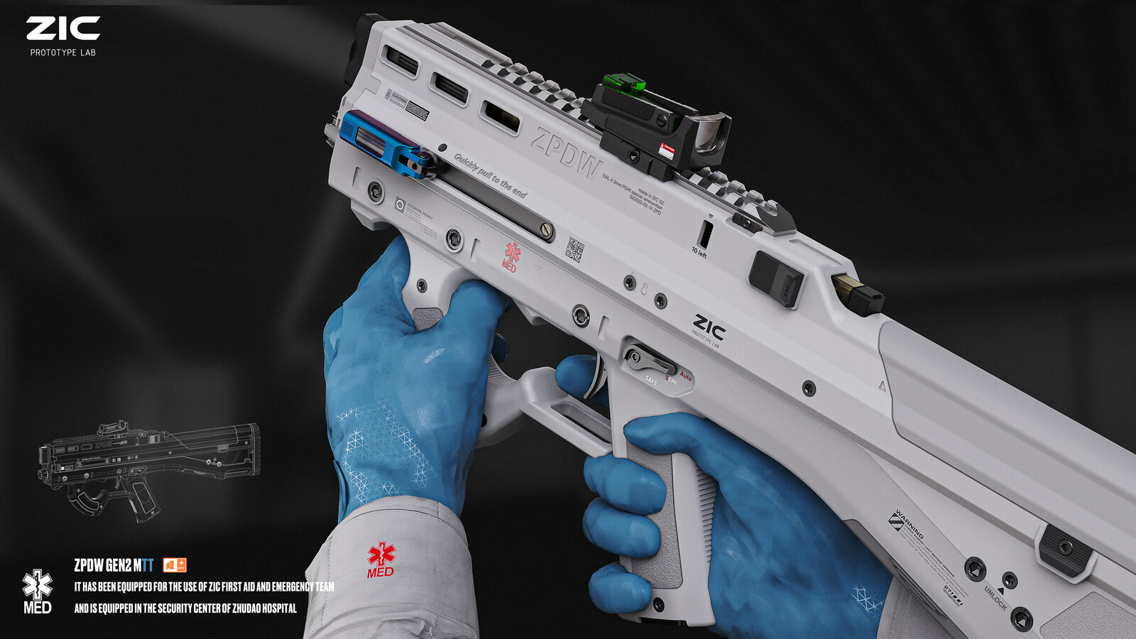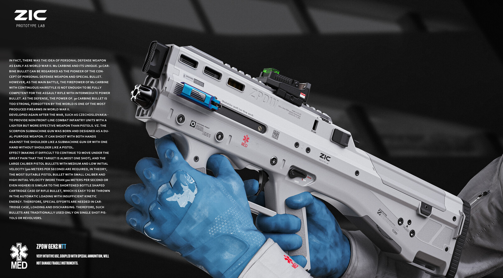 The idea behind the design is a simple, intuitive weapon. The usage scenario is a weapon used by non-combatants for mid-range self-defense. It uses a shotgun-like ammo, but smaller, with finely divided spikes inside, which reduces penetration and enhances stopping power, has 45 rounds of ammo and a fully automatic fire mode.
