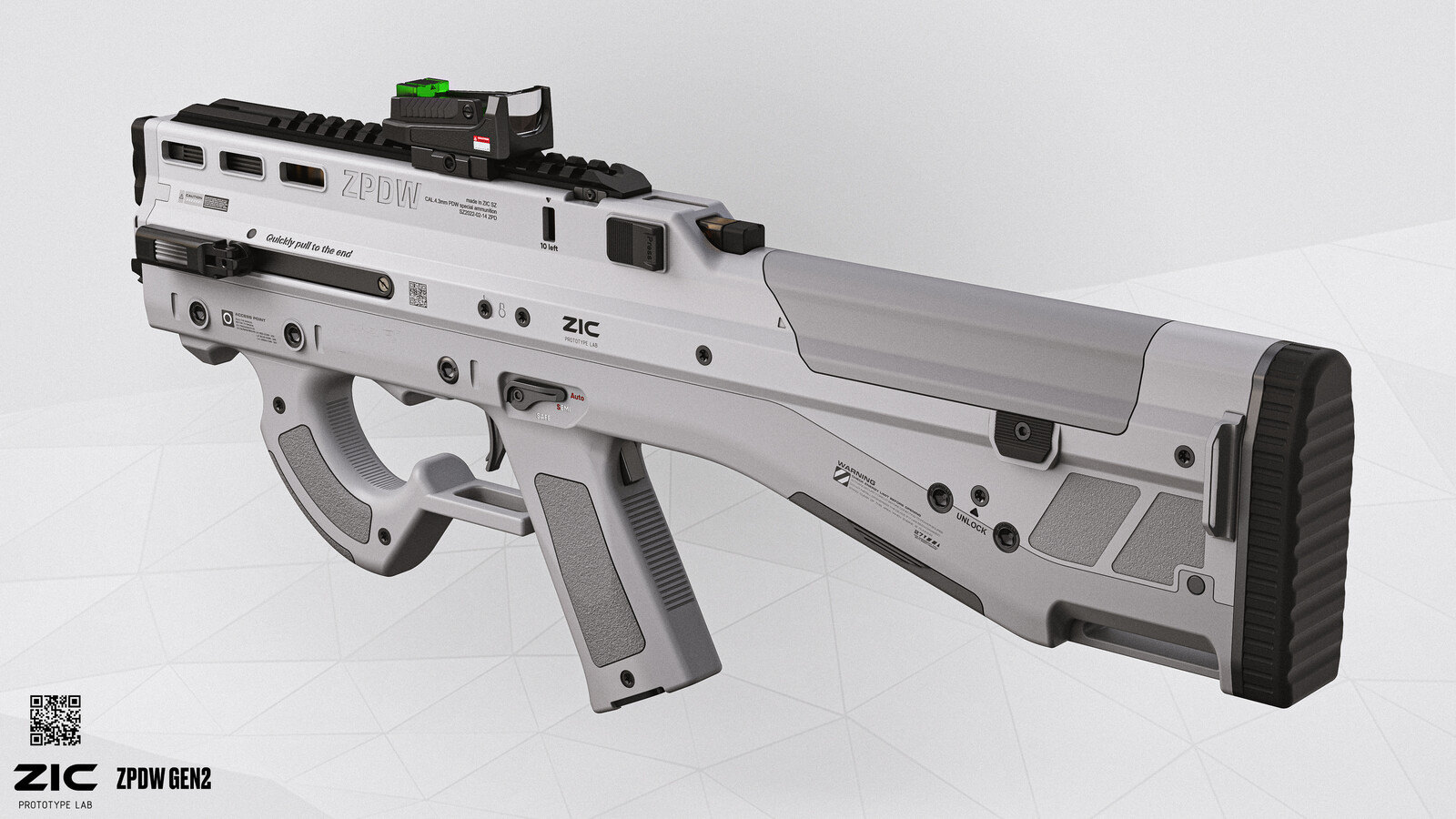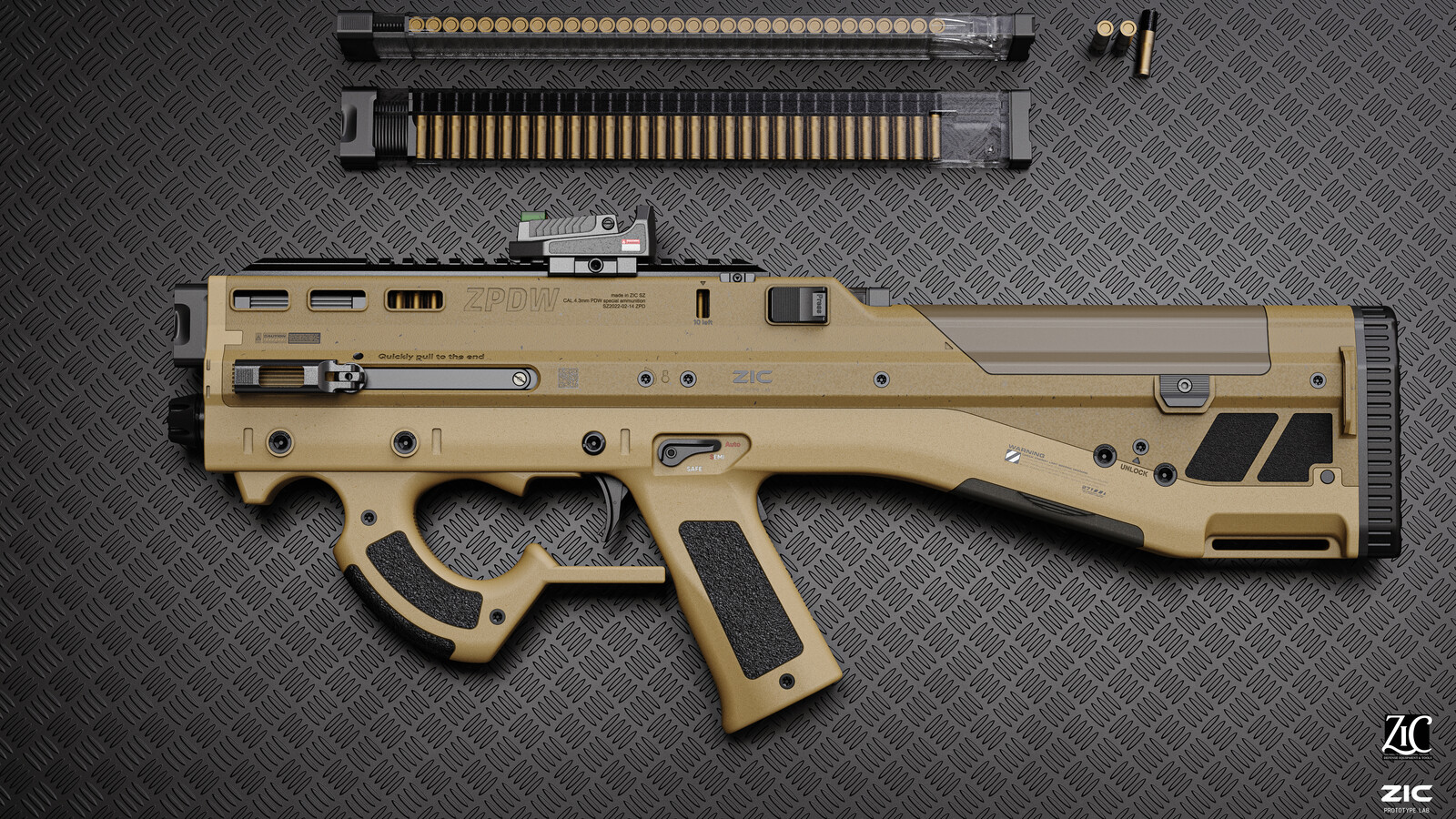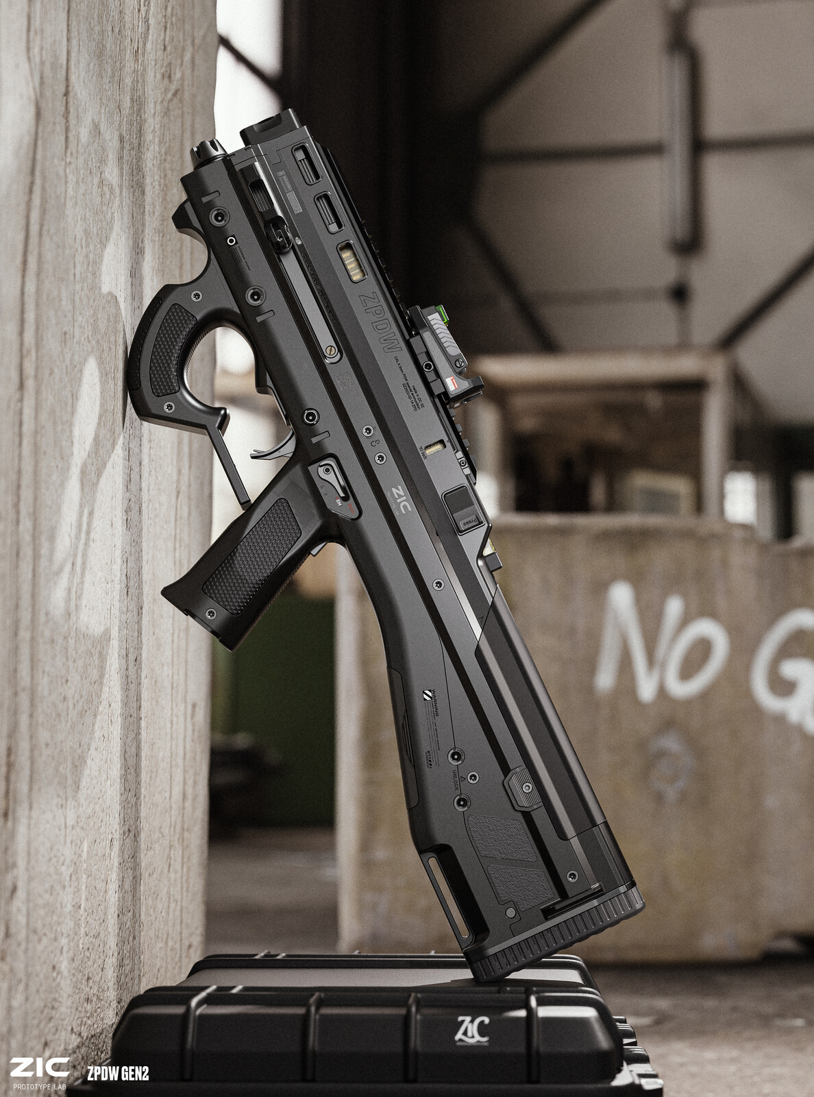 The idea behind the design is a simple, intuitive weapon. The usage scenario is a weapon used by non-combatants for mid-range self-defense. It uses a shotgun-like ammo, but smaller, with finely divided spikes inside, which reduces penetration and enhances stopping power, has 45 rounds of ammo and a fully automatic fire mode.